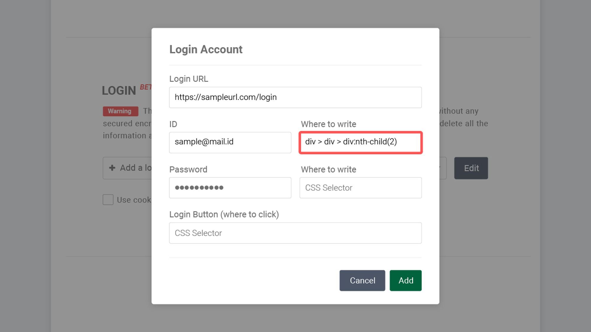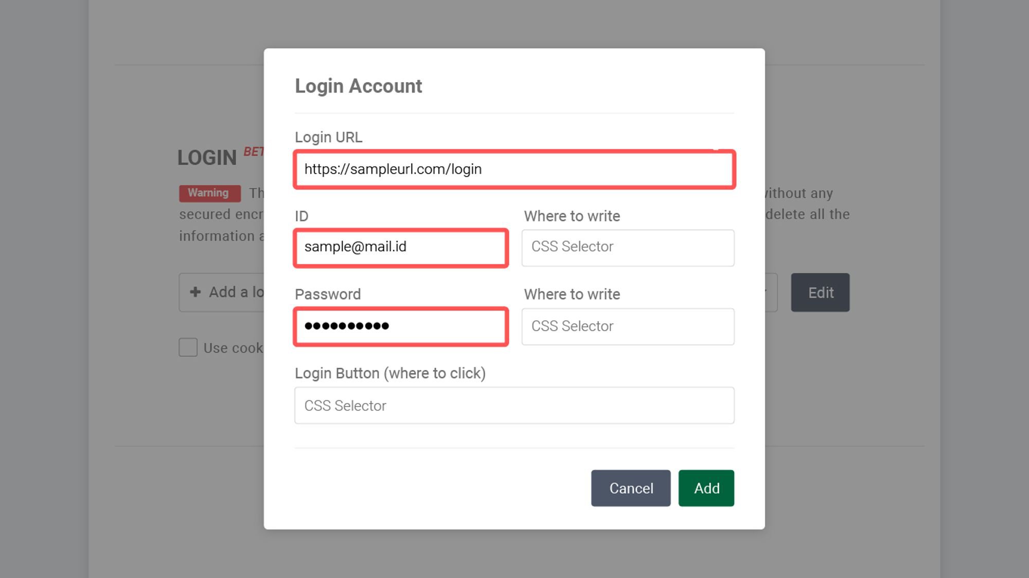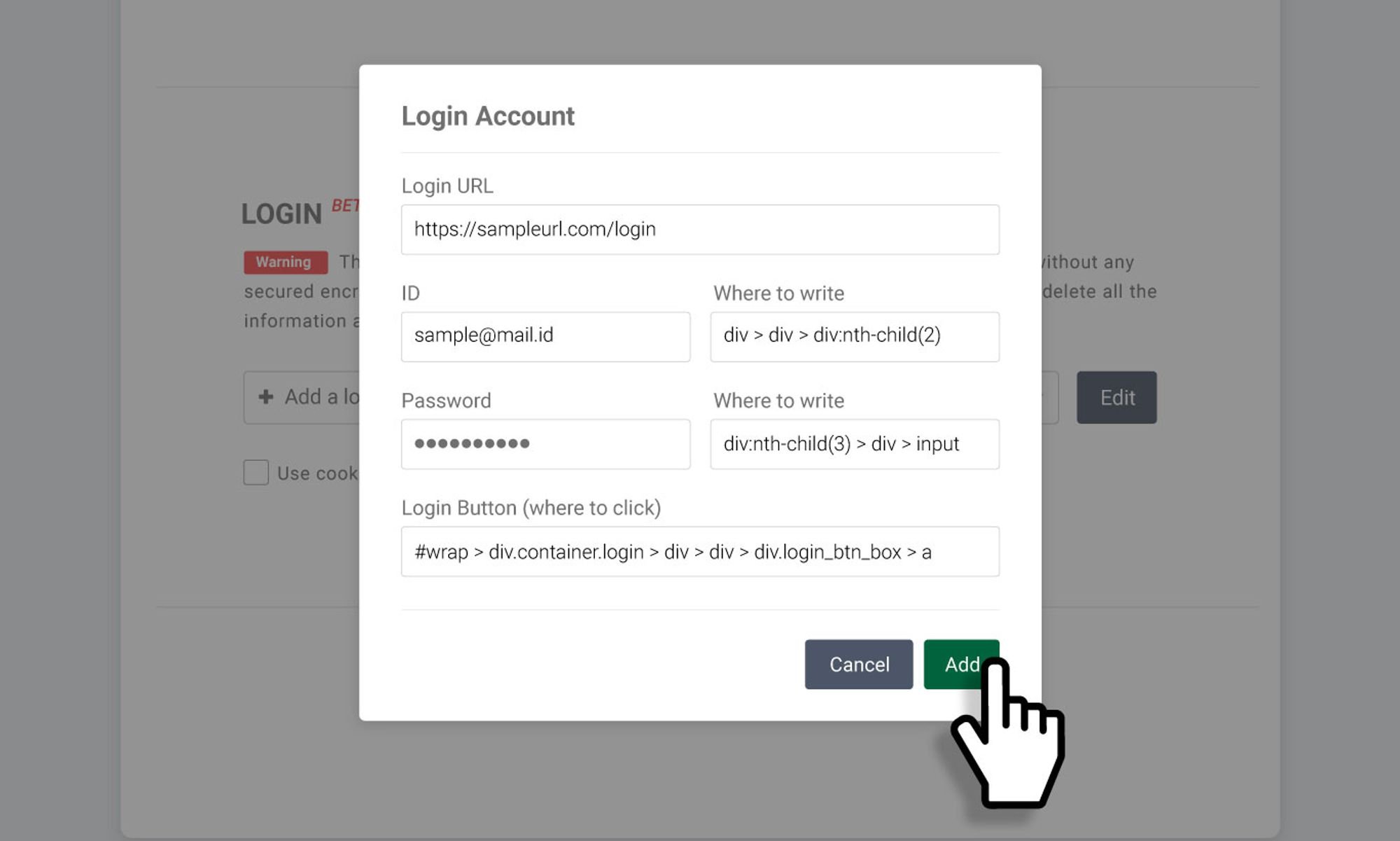 복사한 URL을 첫번째 칸에 붙여넣기하고, ID와 Password 칸에 해당 사이트에서 로그인할 때 필요한 정보를 입력합니다.
