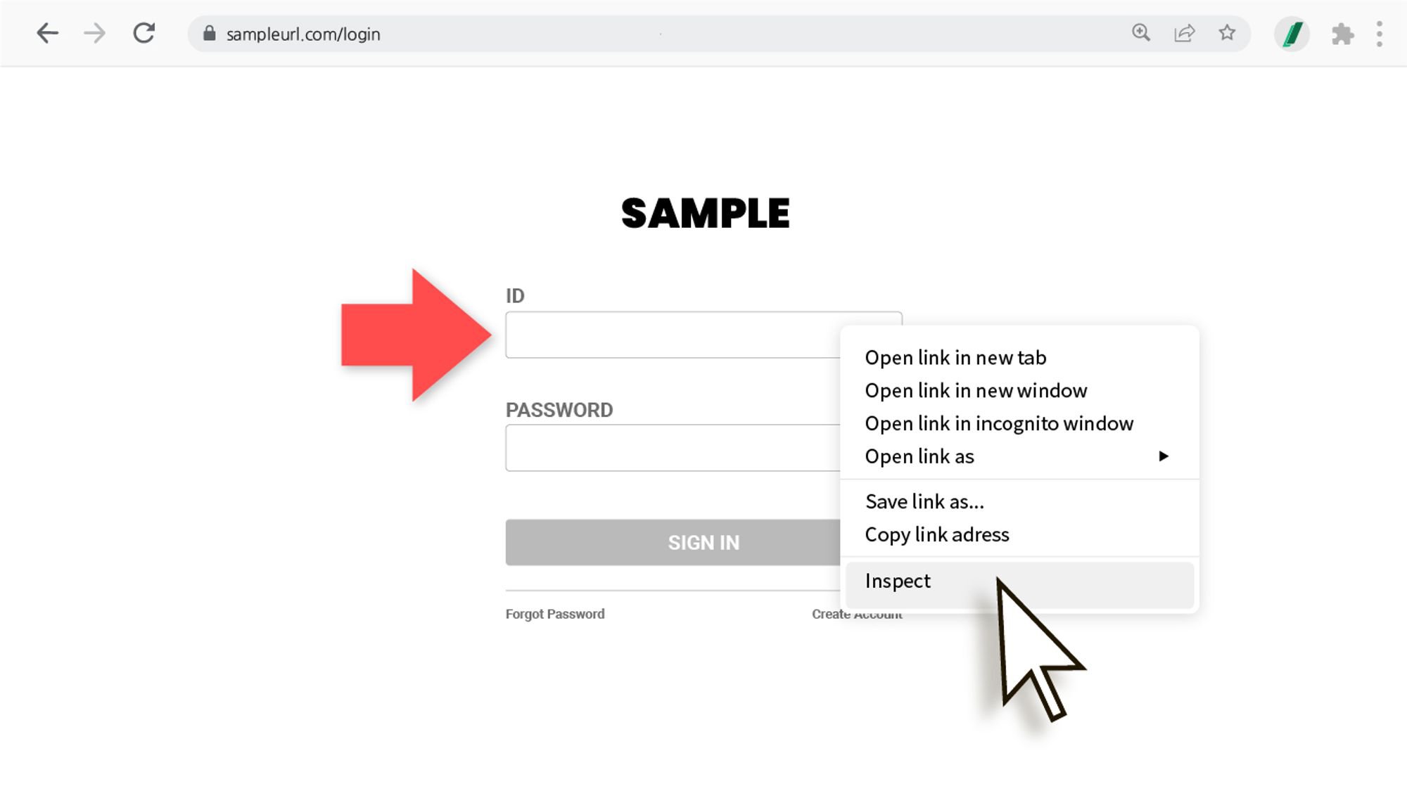 ID를 입력하는 칸에서 마우스 오른쪽 버튼을 클릭하여 Inspect(검사)를 선택합니다.