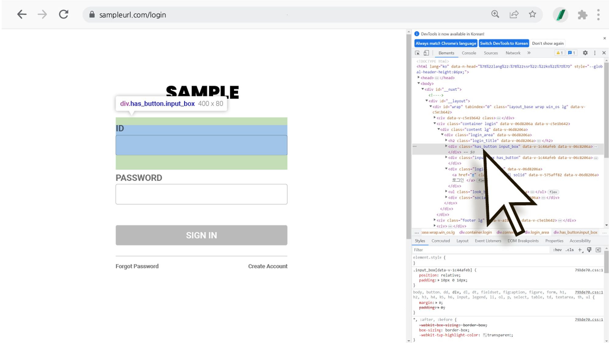 [로그인 버튼]의 selector 값을 복사하실 때에는 버튼 위에서 마우스 우클릭 → Inspect(검사)를 선택하시기 전에 위 이미지와 같이 로그인 버튼이 활성화 된 상태로 두고 진행하시면 더 안정적인 selector 값을 얻으실 수 있습니다.
