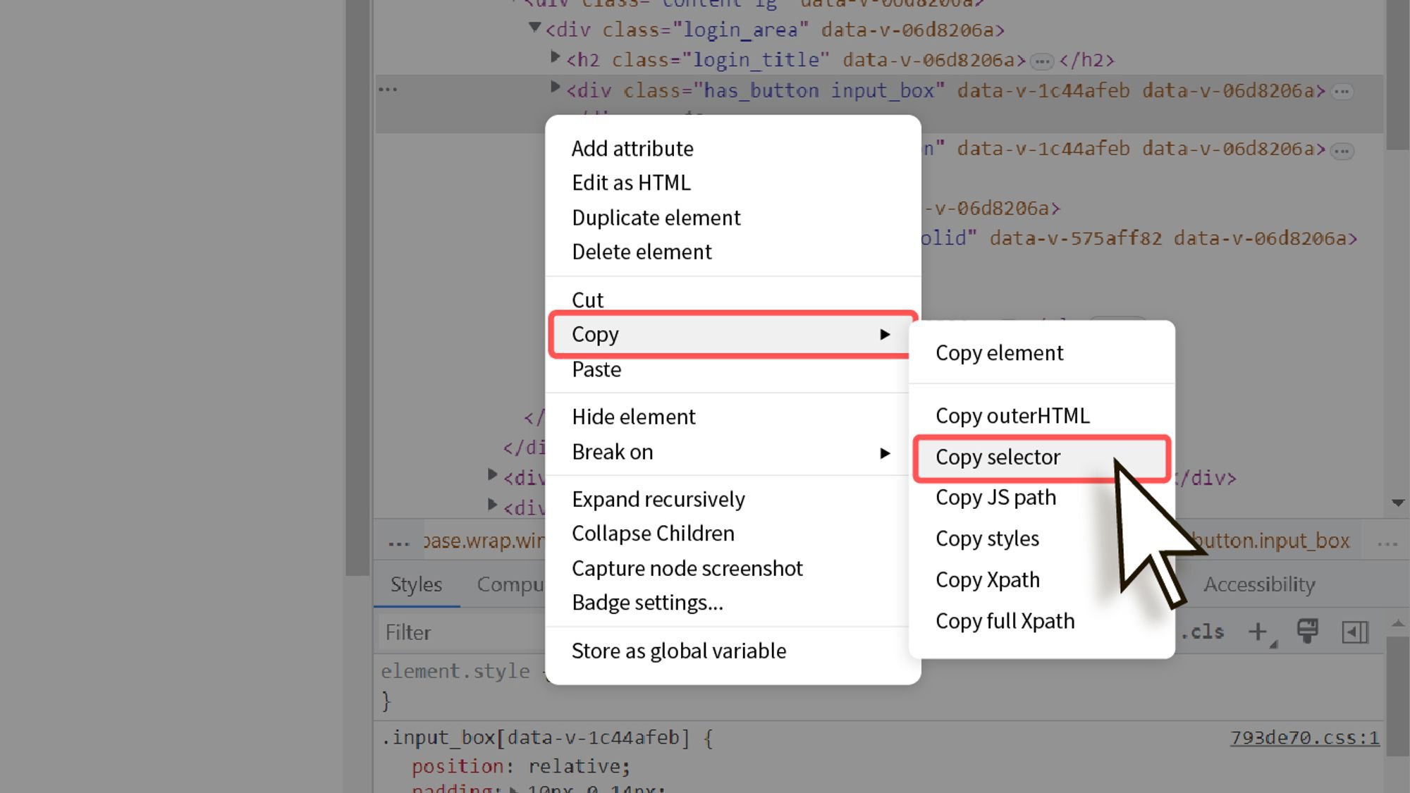 회색으로 강조 표시된 코드 위에서 마우스 오른쪽버튼을 클릭하여 Copy -> Copy selector를 선택하시면 자동으로 해당 selector의 값이 복사됩니다.